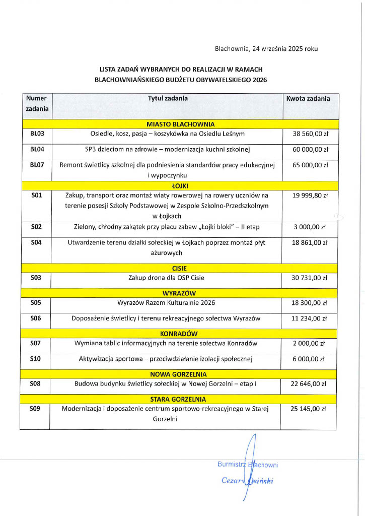 Lista zadań wybranych do realizacji z Budżetu Obywatelskiego