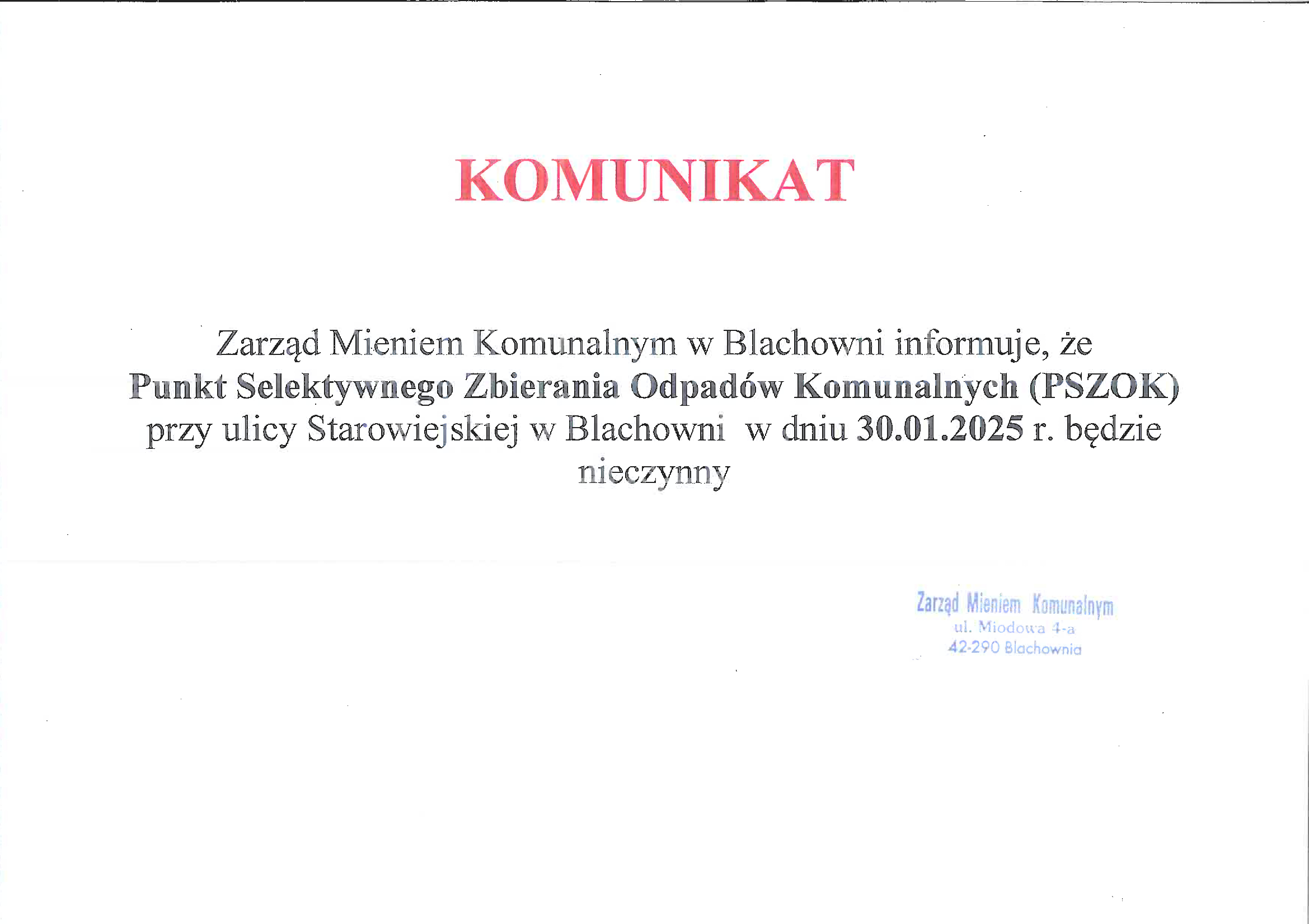 Informujemy: w dniu 30 stycznia br. PSZOK będzie nieczynny
