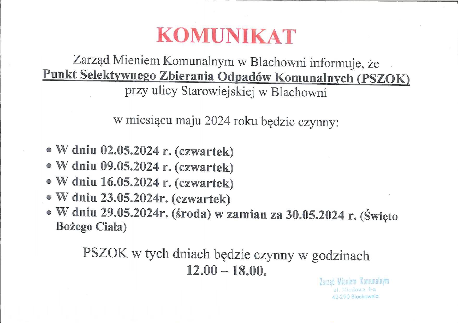 Komunikat Zarządu Mieniem Komunalnym dot. PSZOK