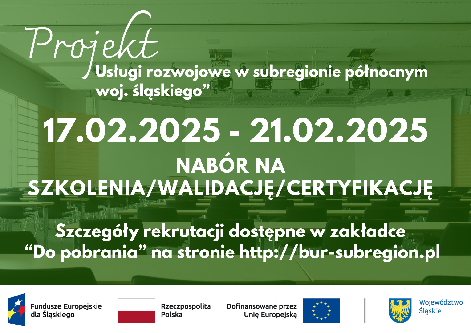 17 lutego 2025 r. rusza kolejny nabór w projekcie „Usługi rozwojowe w subregionie północnym woj. śląskiego”. Nabór dedykowany będzie szkoleniom/walidacji/certyfikacji. Z procesem rekrutacji zapoznać się można na stronie internetowej w zakładce "Do pobrania" na stronie internetowej projektu http://bur-subregion.pl