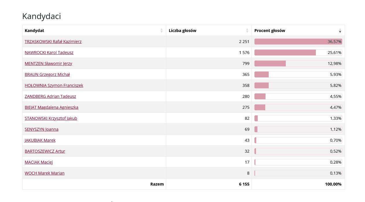 Drugie miejsce zajął Karol Nawrocki, uzyskując 25,61 procent poparcia.